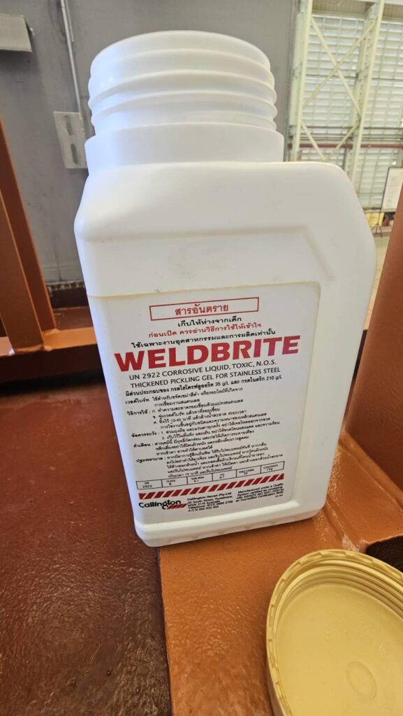 Weldbrite utilises innovative Australian technology for the formulation of a high adhesion stainless steel pickling gel for spray pickling applications It is used to remove the black oxide marks or burn scale left during welding of stainless steel. After use of Weldbrite the weld area should have the same look as the rest of the steel being used. Weldbrite leaves a clean professionally